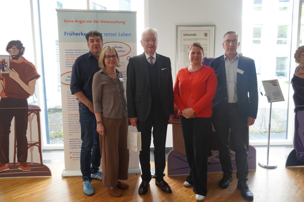 Die Kampagne „Familiärer Darmkrebs: Früh informiert – besser geschützt!“ inzwischen in der Kreisverwaltung in Ingelheim Station gemacht. Diese Kampagne wurde im vergangenen Oktober im Landtag in Mainz in Anwesenheit hochrangiger Landespolitiker eröffnet und gastierte bereits im Februar bei der BASF. Sie ist von der Landeszentrale für Gesundheitsförderung (LZG) und der Stiftung LebensBlicke konzipiert worden, wird vom Land und von der BARMER Krankenkasse unterstützt. Der betriebliche Gesundheitsmanager Sascha Knospe hatte die Veranstaltung bestens vorbereitet. Mit fast 90 Teilnehmerinnen und Teilnehmern war der Veranstaltungsraum fast vollständig gefüllt. Vor einem sehr interessierten Publikum konnten Professor Riemann, Vorstandsvorsitzender Stiftung LebensBlicke und Stefanie Hönle von der LZG in Diskussionen auch mit den Teilnehmenden in die Kampagne einführen. Die Veranstaltung war von der Kreisbeigeordneten Almut Schultheiß-Lehn sowie dem Leiter des Gesundheitsamtes Dr. Dietmar Hoffmann eröffnet und skizziert worden. Ein weiterer Höhepunkt war die Ausgabe von Stuhltesten zur Selbsttestung, die großen Anklang fand. Wieder einmal hat die Kampagne gezeigt, dass bottom-up Aufklärung an der Basis ein Volltreffer sein kann. Danke für das große Engagement der Kreisverwaltung. Solche Beispiele sollten Schule machen! Fotos: Kreisverwaltung Mainz-Bingen