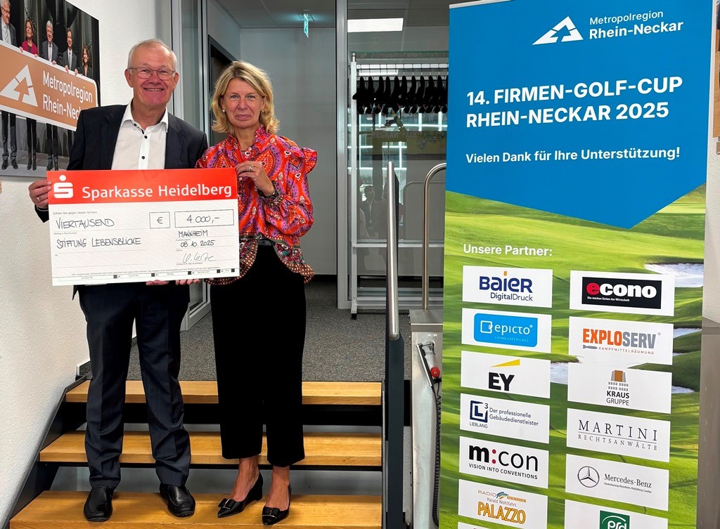 Beim diesjährigen Firmen-Golf-Cup der Zukunft Metropolregion Rhein-Neckar e.V. (ZMRN) wurde eine Spendensumme von 4.000 Euro zugunsten der Stiftung LebensBlicke gesammelt. Die Teilnehmenden hatten die Möglichkeit, unter mehreren Projekten abzustimmen – dabei erhielt die Stiftung die meisten Stimmen. Bei der offiziellen Scheckübergabe am 8. Oktober im Haus der Region in Mannheim nahm Dr. Stefan Webendörfer, stellvertretender Vorsitzender des Stiftungsrats, die Spende persönlich entgegen. „Die Stiftung LebensBlicke bedankt sich herzlich für die großzügige Unterstützung. Dass unsere Arbeit zur Darmkrebsvorsorge so große Wertschätzung erfährt, ist für uns ein besonderer Ansporn“, betonte Professor Dr. Jürgen Riemann, Vorstandsvorsitzender der Stiftung. Die Veranstaltung bot auch Gelegenheit zum Austausch mit weiteren begünstigten Organisationen. Als kleine Stiftung ist LebensBlicke für jede Spende dankbar – sie trägt dazu bei, die Präventionsarbeit nachhaltig zu stärken. Foto: Scheckübergabe | © ZMRN
